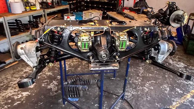 This included the complete stripping of the suspension, brakes and steering unit from the car, then each individual section stripped down, all those old BL bushes, shocks, joints, dampers, discs, springs and joints as well, basically thrown away. Each major section is then shot blasted and powder coated in zinc and then finished in black or another colour should you ask for it, and all wearing, perishable and moving parts renewed with OE or if they are not available, KWE manufactured parts. It’s then all put back together by a single person, only one mechanic to a car, and refitted with a full geometry steering set up done.